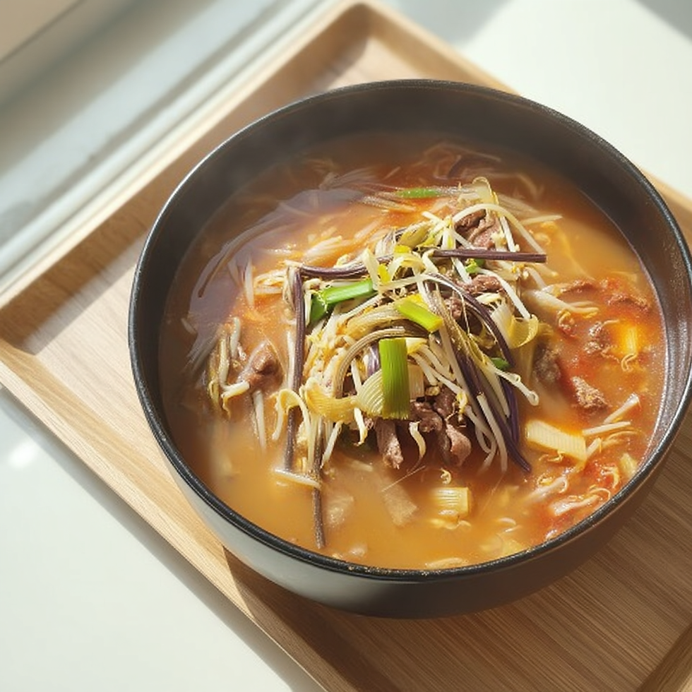 A comforting soup with shredded chicken, fern, mungbean sprouts, and other veggies infused with aromatic spices.