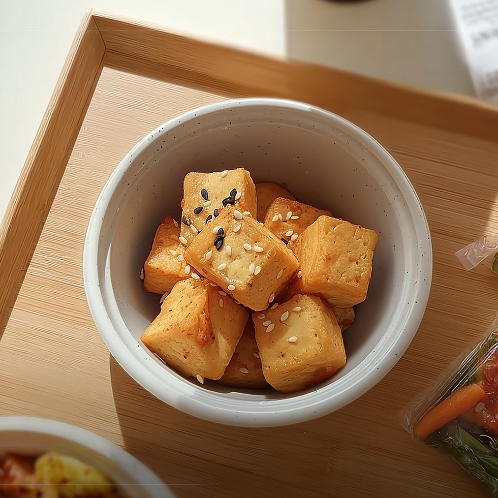 tofu, green onion, minced carrot, minced onion, soy sauce, fish sauce, water, corn syrup, sesame oil, paprika powder, pepper