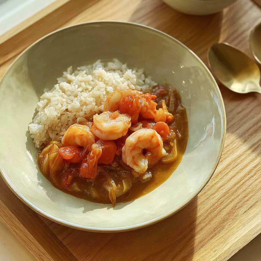 Rich curry with browned onions and carrot to enhance naturally sweet flavors topped with shrimp